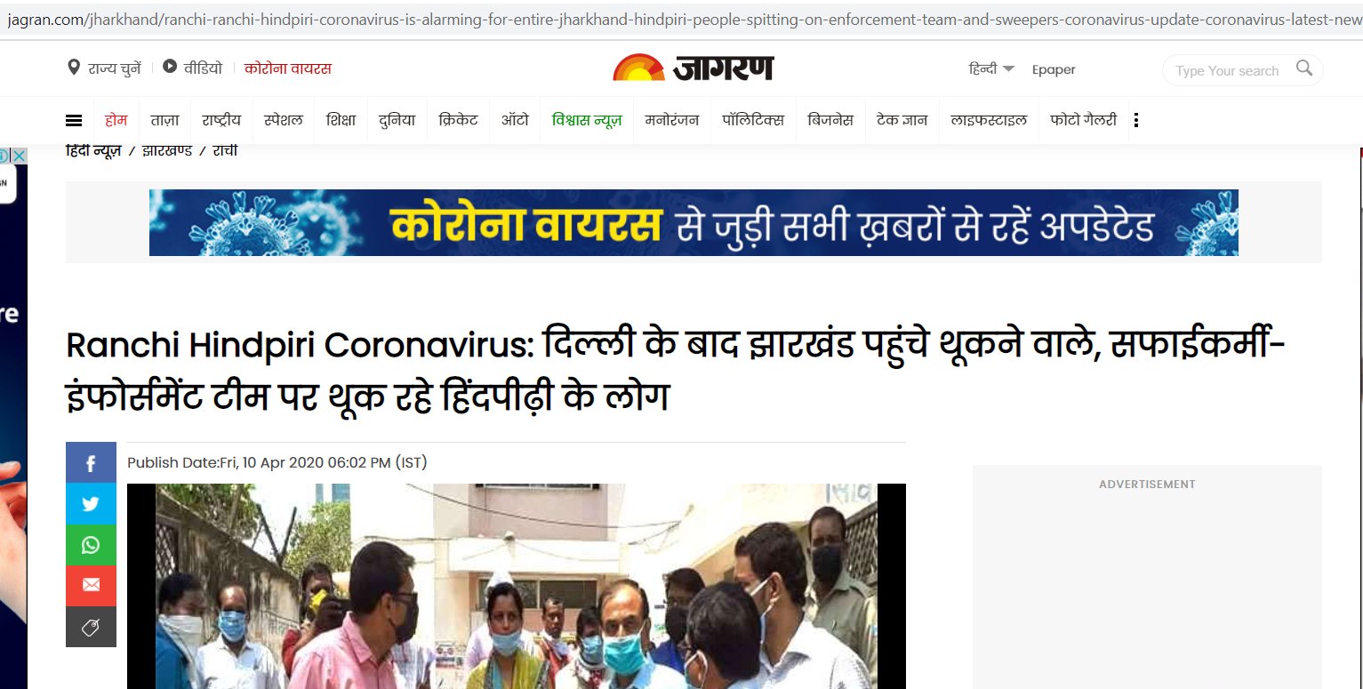 Abhishek On Twitter Now In Jharkhand Locals In Hindpiri Area Of Ranchi Spit On Sanitation Workers Hindpiri Is One Of The Hotspots In Ranchi For Wuhan Corona Virus Https T Co N5ymurfpc2